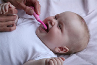 Når barnet bliver større, er det lettest at sidde med barnet på skødet - og støtte barnets hoved mod kroppen. Hold ud i kinden med en finger og børst med den anden hånd.